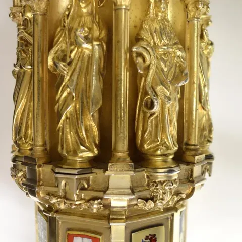 The head of the mace features various symbolic elements. On top is the figure of Mary, the patron saint of Dundee, carrying a shield with a pot of lilies (from the town crest of Dundee) and also holding an olive branch, a symbol of peace. Around the main part of the head there are eight alcoves, each containing a figure, representing the various colleges of the University of St Andrews and subjects taught at University College Dundee.