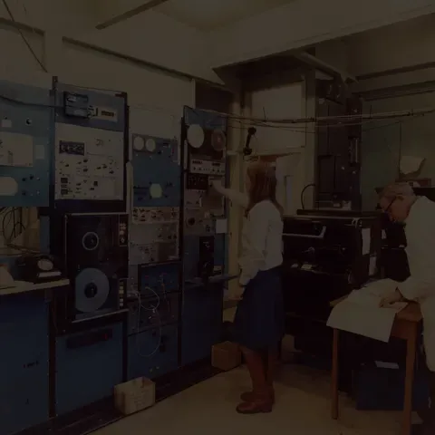 A student and academic maintain a Scanning Radiometer Receiver, circa 1970